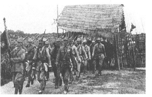 汪精卫伪政府的正规军。这是驻扎沐阳的伪军从驻地出发进攻新四军,注意汪伪军也使用青天白日旗,只是旁边多一个黄三角的飘带。