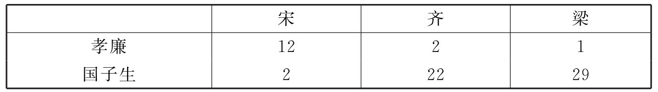 孝廉察举与学校明经都采用经术射策,但南朝孝廉却越来越少见到,同时除陈朝以外,学校明经却呈现增长趋势。现将我所考得之宋、齐、梁孝廉与国子生数量,列表对比如下(表10—4):