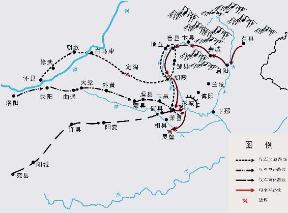 齐国的城阳郡大致在今天的山东日照地区和临沂地区一带,郡治在莒县(今山东莒县),沂水自南而北流经城阳,在彭城东面的下邳西边汇入泗水。项羽军由城阳奔袭彭城,最近便的道路就是沿沂水河谷南下,走阳都(今山东沂南县南部)—启阳(今山东临沂北)—兰陵(今山东苍山县西南)—傅阳(今山东枣庄市东南)一线直扑彭城。然而,项羽军进入阳都南部的启阳城后,突然改变方向,西去进入今浚河河谷,走费城(今山东费县北)、郚城(今山东泗水县南),由泗水河谷抵达楚国的薛郡鲁县(今山东曲阜)[23]。