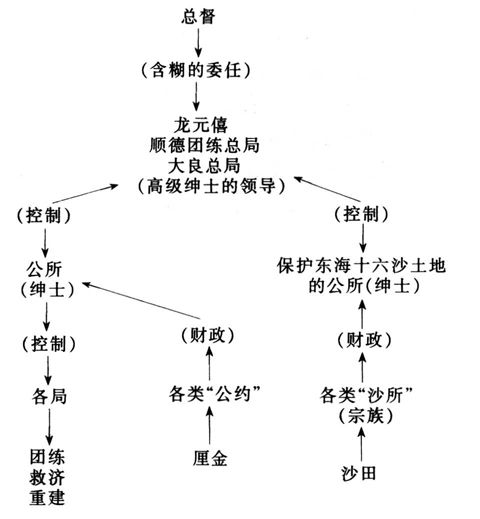 龙并没有撇开叶名琛总督而独立行动。相反,叶认为像龙元僖、陈松这样的人可以帮助广州同到处散布在农村的独立的团练组织建立某种正式关系。政府如果打算恢复与广州乡村的联系,它就必须利用这些高级绅士去组织环绕广州的团练局,它们在理论上应听命于广州并由广州任命长官。于是,1855年5月7日,叶命令龙元僖在大良南边的一所当地祠堂中开设顺德团练总局。在这里,18名乡绅在龙的指挥下,负责重建乡村和防卫。[155]