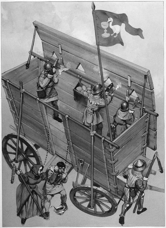 ◎ 胡斯军队利用大车对抗德国骑兵。