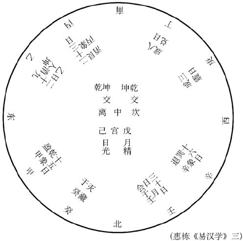 坎离配戊己,居中央。离为日光,本居中央;坎为月精,于“晦夕朔旦”时,月亦“流”此。以八卦配十母,尚余壬癸无所配,仍以乾坤配之。所谓“壬癸配甲乙,乾坤括始终”也。更以图明之:(见下图)