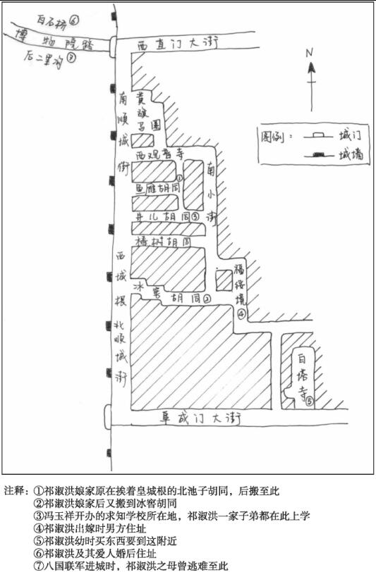 我们那时独门独院惯了,最低也是两家,还都是老街坊,到今儿想来,女孩子不让串门子,不许站街,不许卖呆儿注32,不许一个人出去溜达,散步。多大了家里都有人跟着。那会儿左邻右舍差不多都是旗人,也都知道谁是不是旗人,不像这会儿净搬家,那会儿讲究一住就住几辈子,谁都知道谁。