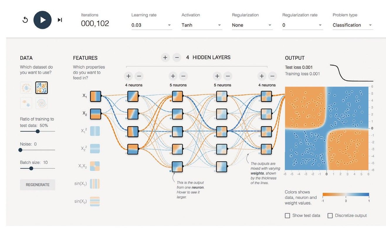 补充一点:目前,已经出现了一些可视化的工具,能够帮助我们“看见”深度学习在进行大规模运算时的“样子”。比如说,谷歌著名的深度学习框架Tensor Flow就提供了一个网页版的小工具,用人们易于理解的图示,画出了正在进行深度学习运算的整个网络的实时特征。