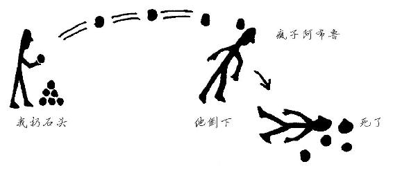 他在某本书中读到,如果把待解决的问题画出来,直观地描述其方方面面,那个问题就能得到解决。于是,一天里有大半时间,我坐着读书的时候,他都在画为哥哥们报仇的计划图解,里面的人物都是火柴人的形象。我们发生争执后一星期左右,我无意中发现了那些图,吓坏了。在第一张图里,奥班比用削尖的铅笔画了他怎么朝阿布鲁扔石头,让后者倒地而亡。