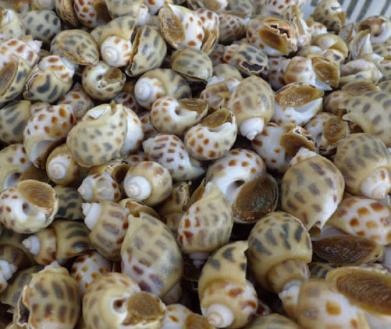 花螺嗅觉灵敏,平常潜伏在沙子里,不见踪影,牡蛎投下去,还在水里缓缓落着,下方的螺已经钻了出来,待完全着地,附近的螺接二连三往外打滚,很快有了蔓延之势,牡蛎落下的地方就像是一座座小小坟墓。等投完最后一池,前面的已快吃完,螺大多又钻回沙里,只剩下透明虾壳。这时捞一捞虾壳,换一次水,一天的事情就算做完了。