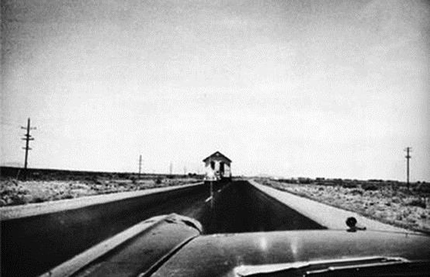 有些温诺格兰德的镜头与弗兰克和兰格开阔的公路类似,但其广阔因为轿车的内部框架而变得可控。我们坐在驾驶座上这一事实拉近了距离并使之变得熟悉,甚至有一种在家的感觉。这一点你也可以从另外那些摄自埃尔帕索市附近的大地——天空——高速公路——照片中看到,一所住宅被拖上高速公路:不是拖车住房,而是住宅在临时移动[53]。在另一幅照片中,在达拉斯附近,没有尽头的货运车正在桥上穿越高速公路,从画框的这一头向另一头延伸。远处的天际已被遮盖:不是终点,那仅仅是另一种运输方式。还有在弗兰克作品中瞥见的某种渴望的痕迹,现在简化为一种简单的对停下来的不情愿,一种对到别处去的疲惫的坚持。契弗写道:“所以,人们看到的这一在路上的伟大的流浪民族,由敲诈联盟和承包商游说集团,制造商,卡车队拥有者,和各种政客组成。我们见证了大批人热情地为寻找爱而成为流浪者。”