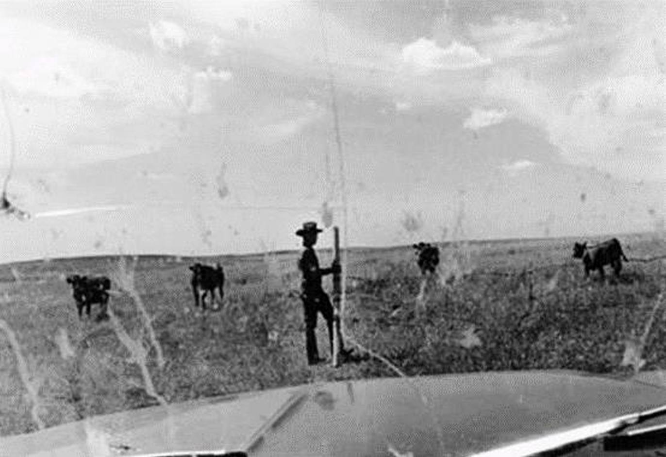 这张不是奥默罗德通过汽车挡风玻璃拍摄的唯一一张照片。在另一张照片中,他向外注视着大草原的广阔草地,一个没骑马的牛仔在对栅栏做些基本维护,纵览整个场景,几头奶牛在反刍,在发怔、出神[55]。天空有条状云彩,而挡风玻璃也有块状的灰泥,间或有昆虫撞击在上面发出噼啪声,它们不知道是什么打到了自己(就像天空突然变成固态)。汽车的引擎盖好像借自温诺格兰德——在画面的底部清晰可见,但有些东西不见了,路不见了。这让人不禁疑惑奥默罗德到底在干什么,为什么在所有作品中他都待在车内。一如既往,该作品包含上述问题的答案。没有路面镜头是因为这是路的尽头。意味着汽车不仅载人到处行走,甚至在路面缺席的情况下也是一种让人观察的方式,一种多少是假设的感知模式;不夸张地说是世界观。(46)美国的挡风罩已经完全被英语化为挡风玻璃。(47)