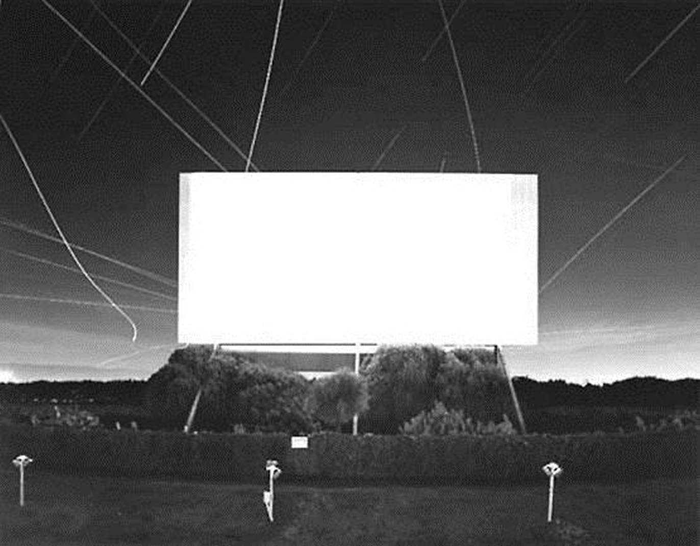 阿勃丝在其照片中瞥见的,杉本博司(Hiroshi Sugimoto)已将其扩展为冥想。他在70年代末开始拍摄的无人电影院和免下车影院,必然被屏幕的白光所占据。曝光时间和电影持续时间相同,杉本博司将屏幕上的一切——追车,谋杀,闹剧,背叛,罗曼史——都简化为绝对白色的一刻。通过这种方式,“时间穿过了(他的)照相机”。作品《尤宁城免下车影院》(1993年)的白屏不是由影院而是由夜空构成的[58]。由于长时间曝光,飞机和星星的轨迹成为暗夜中的淡痕。同时在屏幕上,无论是已逝或正当红的明星——都成为静止光源的纯粹投影。